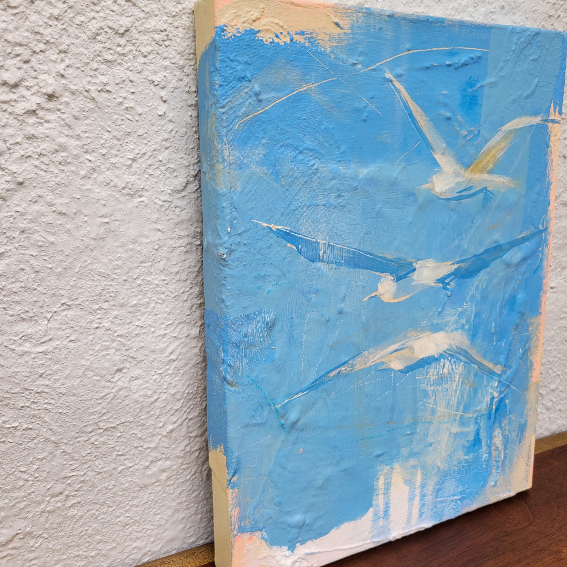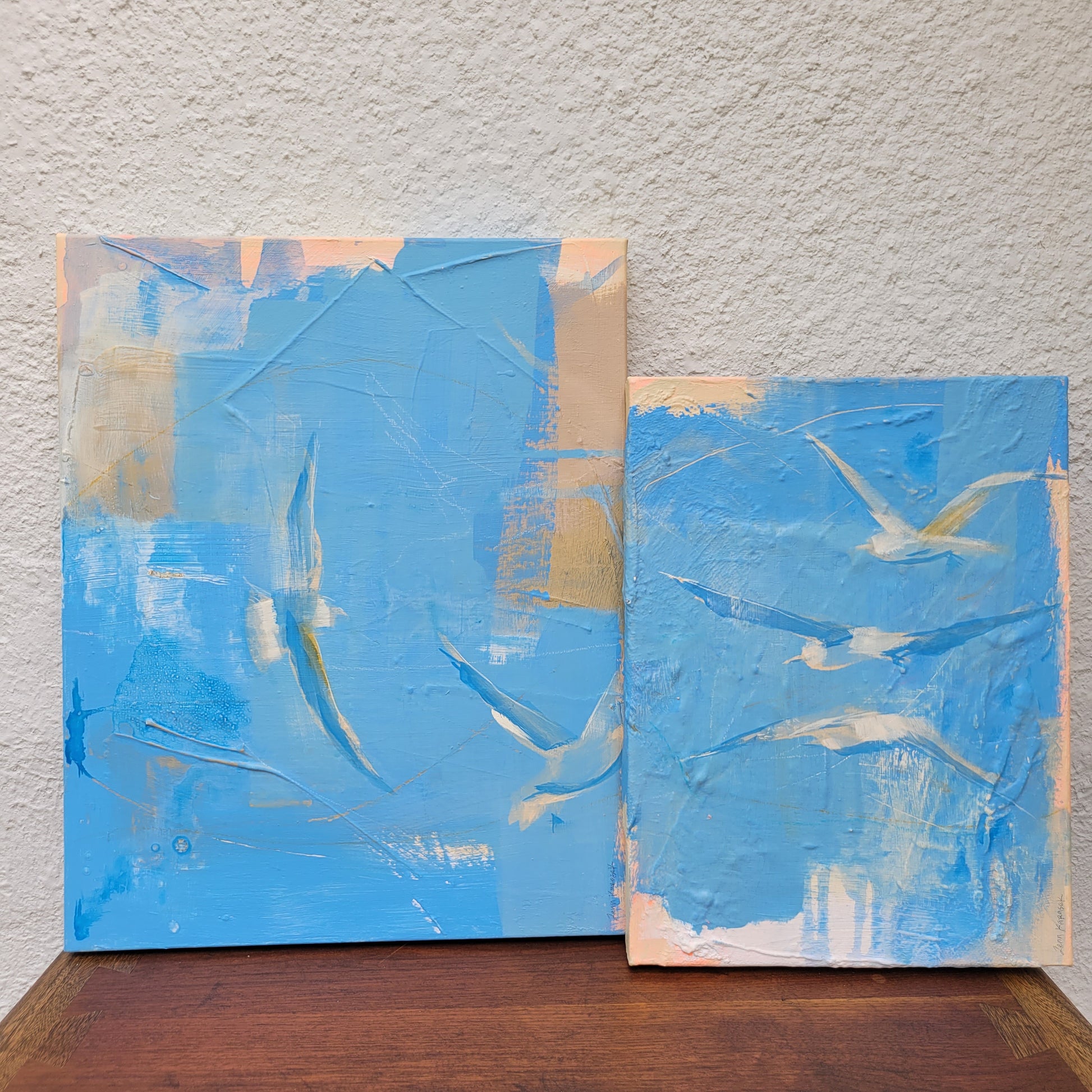 Soft layers of blue unfold like quiet sky and deep water, forming birds that feel more sensed than seen. Each piece is built through texture—scraped, lifted, and weathered—so the surface holds a history of movement, like wind passing through feathers. Shades of indigo, slate, and pale mist blend together, creating a calm, almost meditative atmosphere.